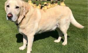 Десятилетний лабрадор Фред из Британии стал заботливым отцом для девяти утят, потерявших мать.